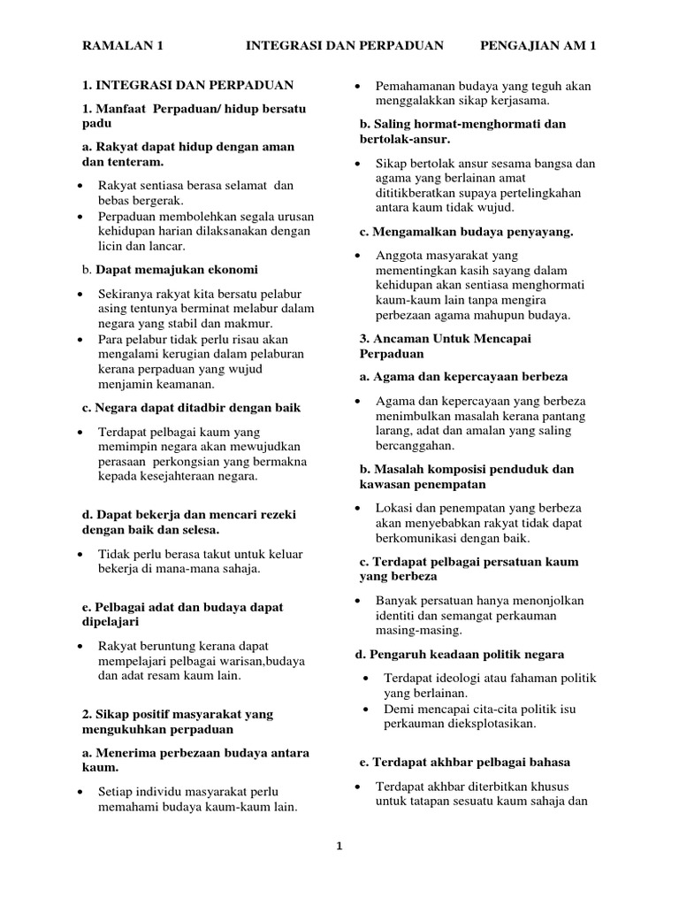 24 skop kajian kajian tentang kepentingan sukan futsal dalam mengeratkan integrasi dan perpaduan dalam kalangan remaja ini terletak di bahagian betong. Bagi mengukuhkan bangsa Malaysia yang bersatu padu kerajaan telah. 1 SOALAN-SOALAN STPM TAHUN-TAHUN LEPAS esei 2013- 2017 TAHUN TEMA TAJUK STPM 2013 Integrasi dan Perpaduan Ekonomi Wawasan 2020 Sosial dan budaya S7-Membina negara Malaysia yang bersatu padu telah diletakkan sebagai cabaran pertama dalam Wawasan 2020Bagi mengukuhkan bangsa Malaysia yang bersatu padu kerajaan telah memperkenalkan.